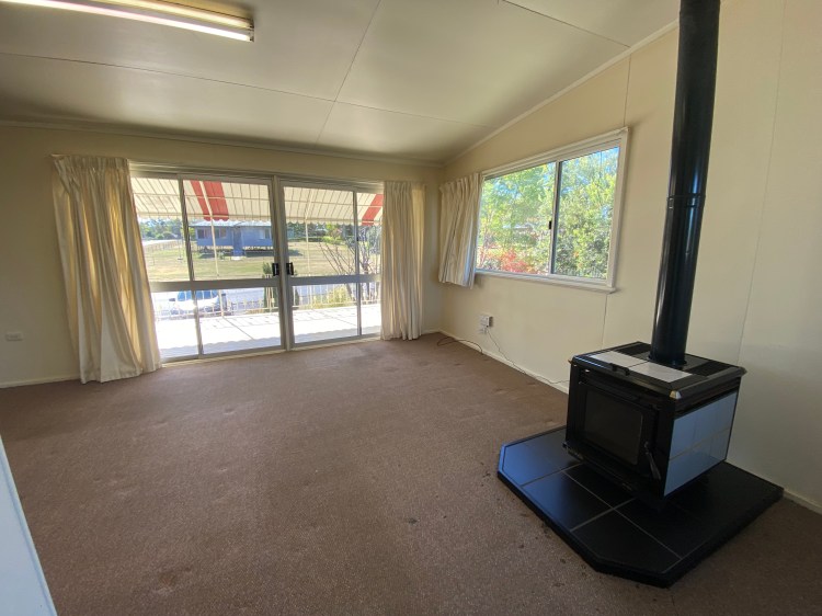 The older style kitchen is functional with ample cupboard space and freestanding electric stove and extends into the dining area. The spacious lounge has a wood heater and opens up onto the north facing front verandah. The home also has ducted evaporative cooling throughout.