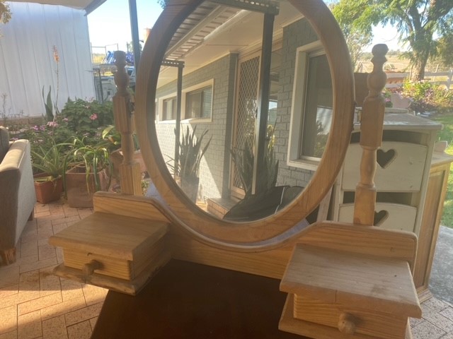 Antiques—Steel Wheels, Coopers Petrol Motor, old Bottles, 2 x Tasmanian Blackwood Single Beds, Dressing Table, Double Bed, 3/4 Bed, Double Brass Bed, Kitchen Cabinets, Table & 6 Chairs, Silky Oak Chair, Wooden Arm Chair, Cane Day Bed, Old Timber Doors, Old Timber Windows, Rocking Horses, Wood Stoves