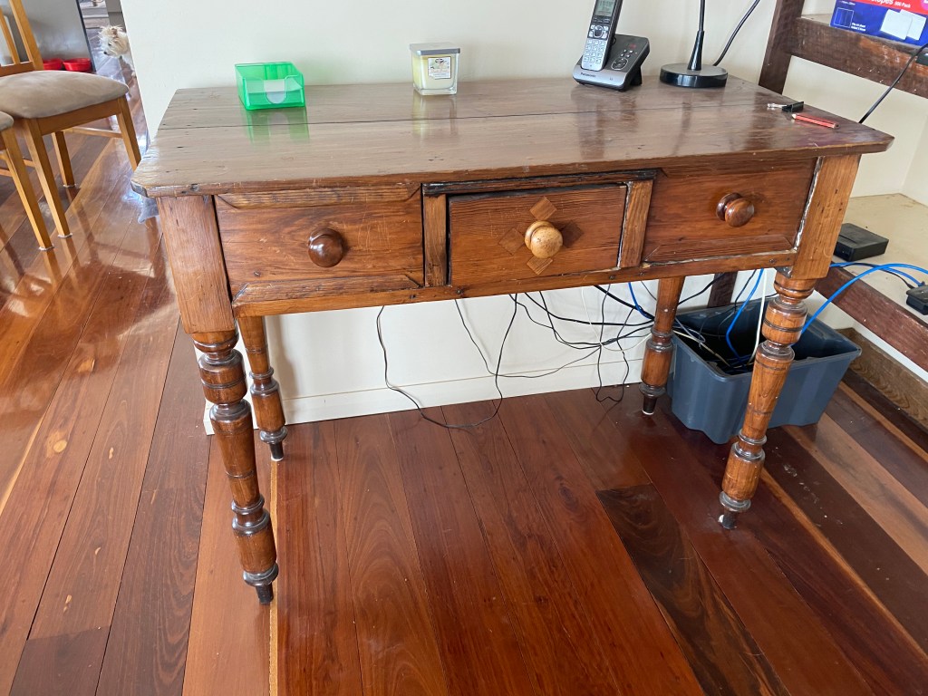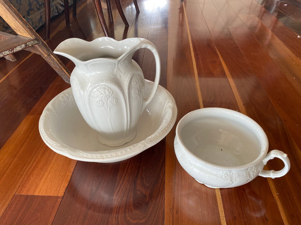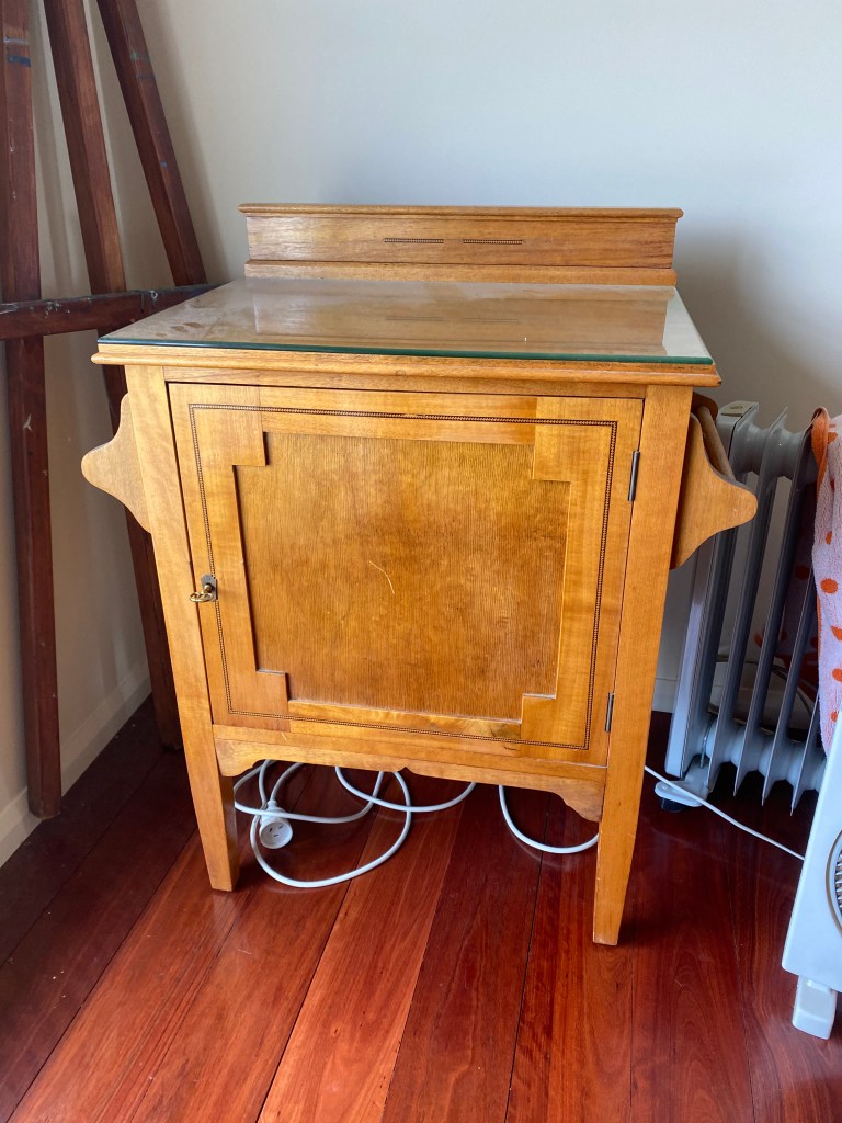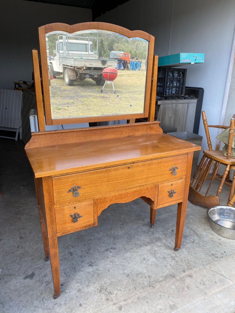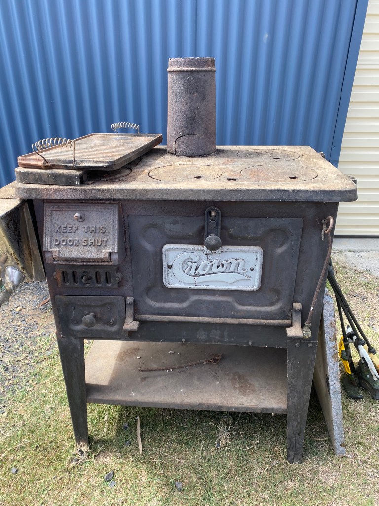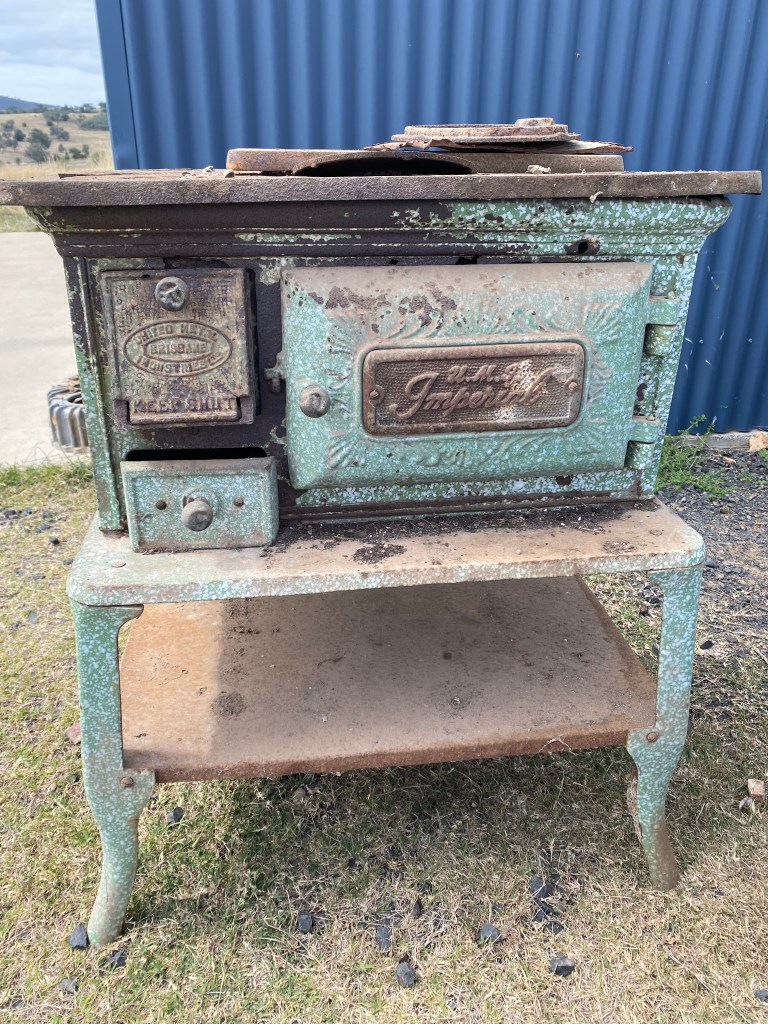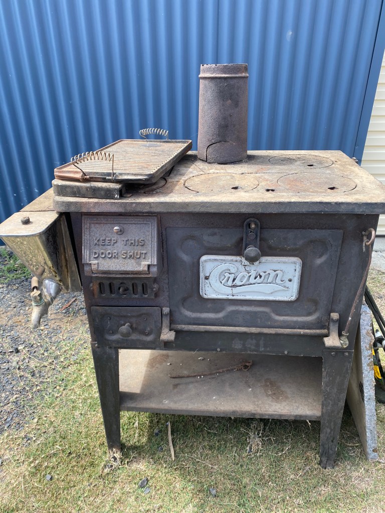 ANTIQUES – SIDE TABLE/DESK, CLAW FOOT BATH, ASST OIL LAMPS, ASST MEMORABILIA, OLD IRONS, BENTWOOD CHAIRS, CROWN WOOD STOVE, IMPERIAL WOOD STOVE, STEP LADDER, 3 DRAWER SILKY OAK DUCHESS, SILKY OAK WASH STAND, VINTAGE LAMP, WASHBASIN SET