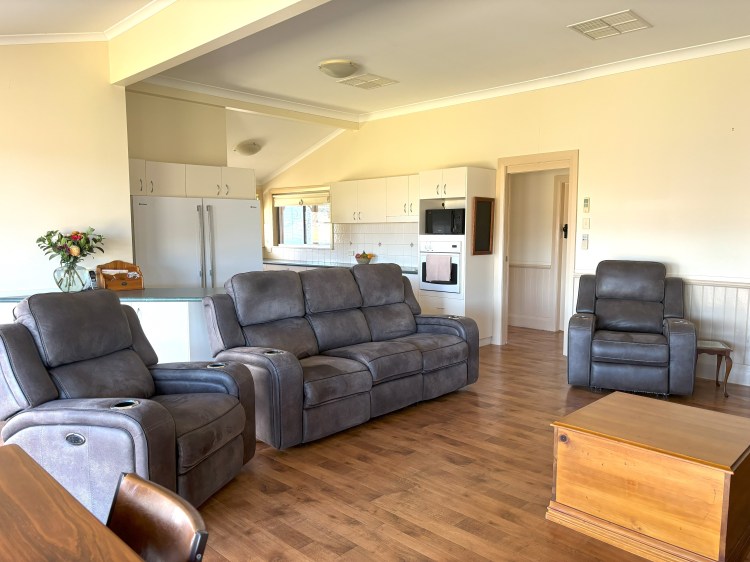 The freshly painted Cornvale homestead consists of a three bedroom, one bathroom main house with three metre ceilings and expansive views over the river flats and pivots. This building has evaporative air conditioning to all the main rooms. There are two living areas within the main home, these being a large kitchen/family room with a large walk in pantry, as well as a separate dining or lounge room. Both of these rooms access the gauzed in verandah via French doors. In addition to the evaporative air conditioning, the family room has a large wood heater for those chilly winter days, and also reverse cycle air conditioning.