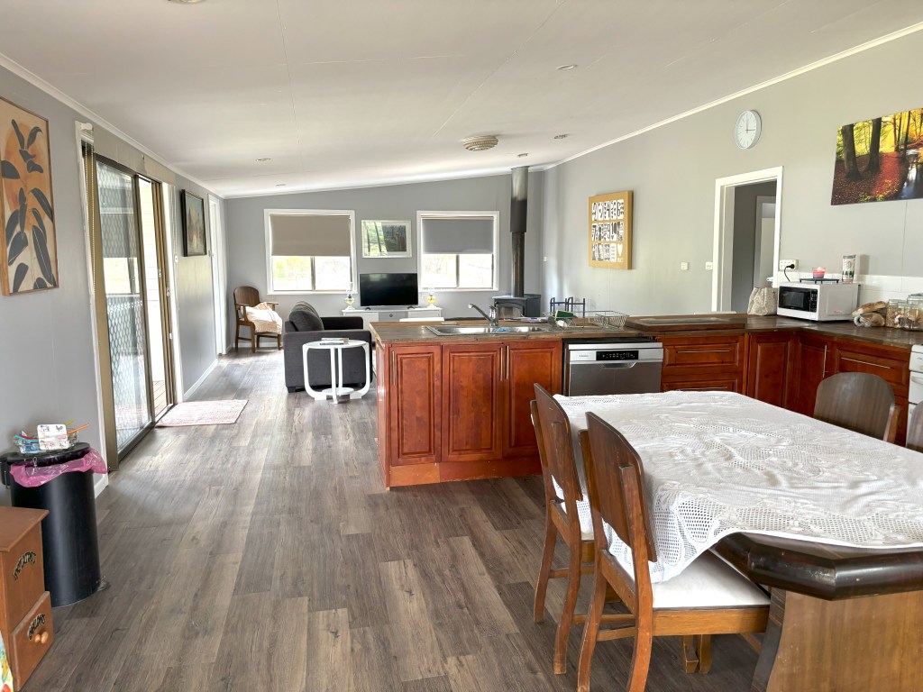 The heart of the home lies in its timber kitchen, complete with modern amenities, including a dishwasher. A new double carport ensures your vehicles are sheltered, while a cutting-edge 10kW solar system allows the property to thrive completely off the grid. Recently painted inside and out, the residence exudes a fresh and welcoming atmosphere.